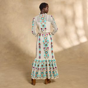 An absolute showstopper. our Ary Embroidered Maxi Dresss is a sleek. figure-flattering column of drama—featuring delicate mesh. brilliant allover floral embroidery and feminine lace at the neck and bracelet-length sleeves. Button front; fully lined. Hand wash. Imported. Sizes XS (0–2). S (4–6). M (8–10). L (12–14). Approx 56l.
