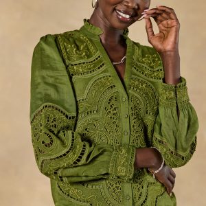 A worldly engineered print is the focus of our graceful Bingham Lace Top. with open embroidered eyelet throughout. natural shell button front and cuffs and ruffle neckline detail. Ramie. Hand wash. Imported. Exclusive. Sizes XS (0–2). S (4–6). M (8–10). L (12–14). XL (16–18). XXL (20–22). Approx. 24.5l.