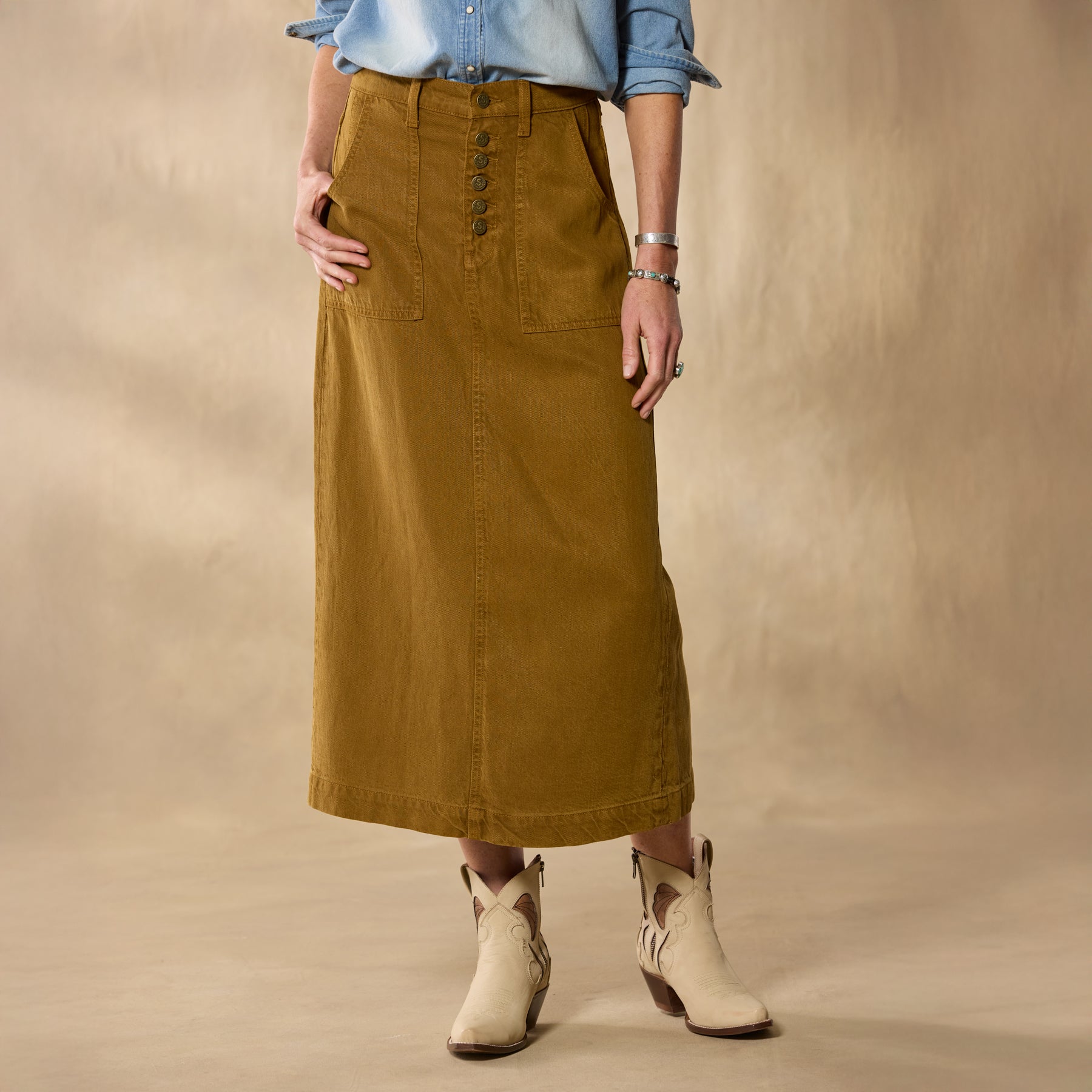 An instant everyday staple. our Bosque Skirt features an ultra-wearable midi length with a button fly. front patch pockets and a back slit. Tencel/linen/cotton. Machine wash. Imported. Exclusive. Sizes 24?C32. Approx. 32.5l.