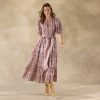 A bold floral with contrasting borders make this tiered maxi dress stand out. Features a beaded tassel at the waist. elastic at the cuffs and smocking on the back. Size up for a more true to size fit. Cotton/silk. Hand wash. Imported. Sizes XS (0-2). S (4-6). M (8-10). L (12-14). XL (16-18). Approx. 55l.