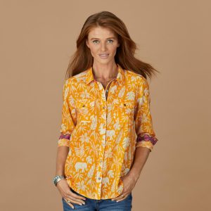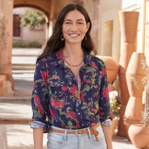 Cheerful floral print on our soft top with patch pockets. back yoke and button cuffs. Cotton. Machine wash. Imported. Exclusive. Sizes XS (0 to 2). S (4 to 6). M (8 to 10). L (12 to 14). XL (16 to 18). XXL (20 to 22). Approx. 27L.