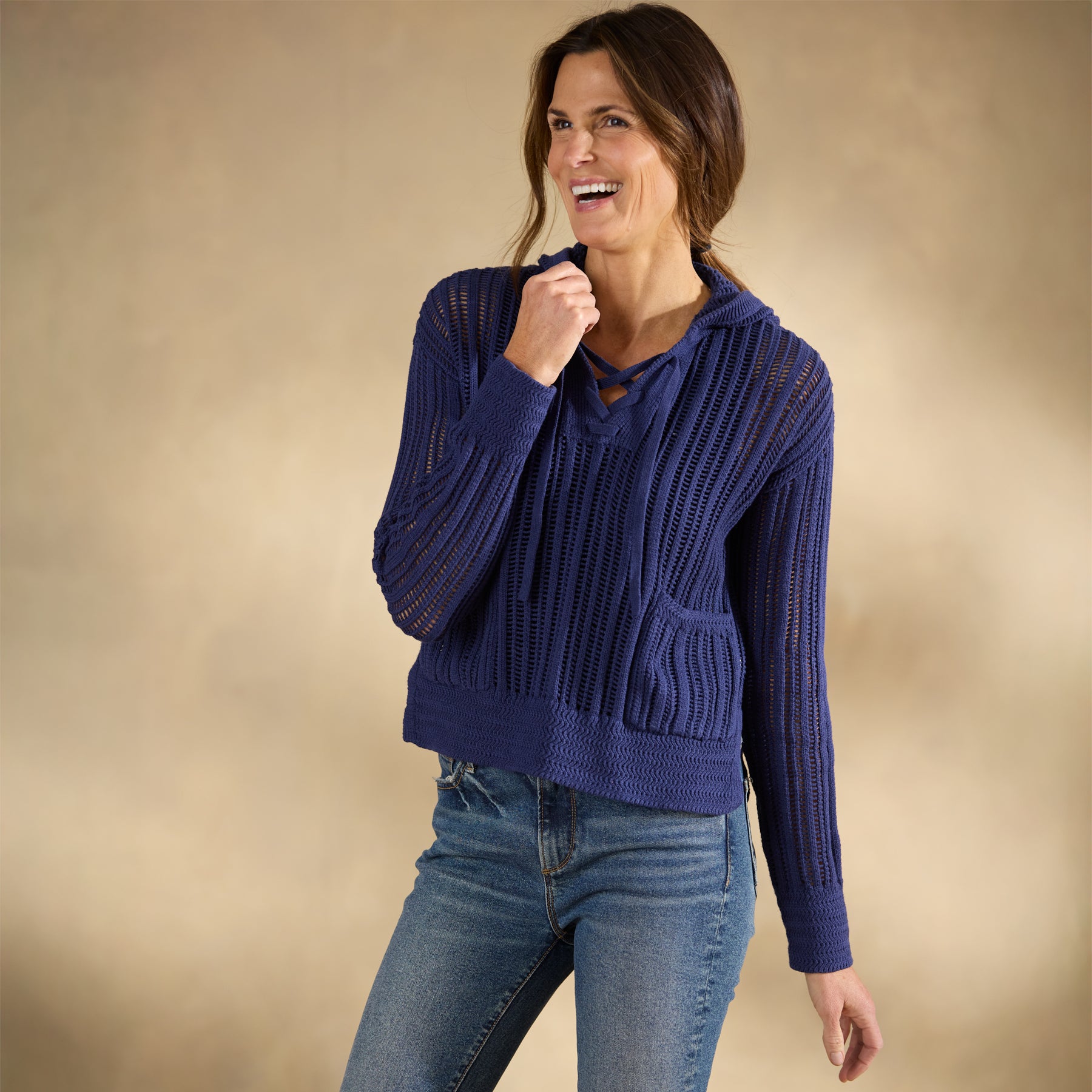 Our Harbor Call Hoodie is the the grown-up version of your favorite childhood pullover: a soft open-stitch sweater with a drawstring hood. patch pockets and just-right beachy vibes. Cotton/rayon/nylon. Hand wash. Imported. Exclusive. Sizes XS (0–2). S (4–6). M (8–10). L (12–14). XL (16–18). XXL (20–22). Approx. 20.5l.