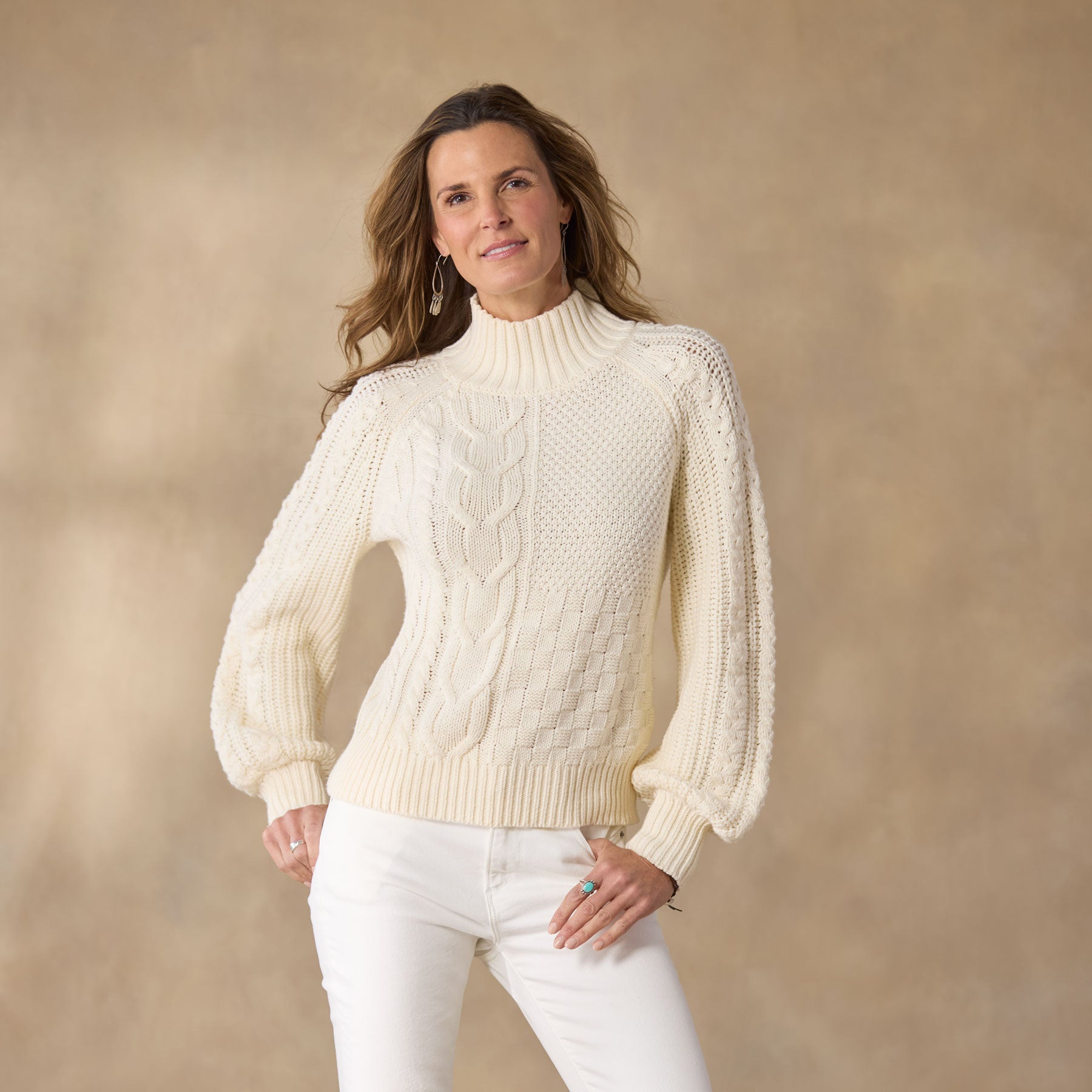 A celebration of texture. our patchwork-inspired mixed stitch pullover pleases so with a tonal marled look. mock turtleneck. rib trim and subtle volume sleeves. A great everyday staple. Hand wash. Imported. Exclusive. Sizes XXS (00). XS (0–2). S (4–6). M (8–10). L (12–14). XL (16–18). Approx. 21l.