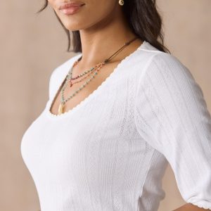 Your new everyday essential elbow length tee is a must have for layering or to wear alone with pretty pointelle fabric and an easy scoop neckline featuring scalloped lace. Cotton. Machine wash. Imported. Exclusive. Sizes XXS (00). XS (0?C2). S (4?C6). M (8?C10). L (12?C14). XL (16?C18). Approx. 23l.