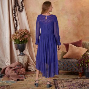 A vintage silhouette is updated in vibrant crinkle chiffon with embroidered mesh neckline. asymmetrical ruffle and elastic ruffle sleeves. Fully lined. keyhole button back. Viscose. Hand wash. Imported. Sizes XS (0-2). S (4-6). M (8-10). L (12-14). XL (16-18). XXL (20-22). Approx. 48l.
