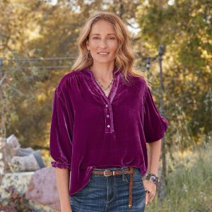 Easy pullover velvet top with puff elastic sleeves. dyed-to-match lace at neckline and sleeves. subtle shirring at shoulders and smoked natural shell henley placket. Hi-lo hem. Viscose/silk. Dry clean. Imported. Exclusive. Sizes XS (02). S (46). M (810). L (1214). XL (1618). XXL (2022). Front approx. 25L.