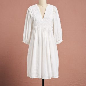 Our window pane textured dress is full of lovely detail with tonal embroidery at the front placket. two shell buttons at the sleeve cuffs. notched V-neck and feminine puff sleeves. Fully lined. two pockets. Cotton. Machine wash. Imported. Exclusive. Sizes XS (0-2). S (4-6). M (8-10). L (12-14). XL (16-18). XXL (20-22). Approx. 38.5l.