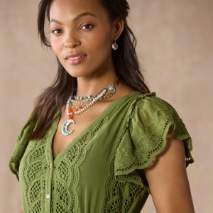 Allover embroidery and soft eyelet tiers add the most feminine touch to our sophisticated V-neck dress with scalloped ruffles at the sleeves. button front placket and a removable belt. Separate slip included. side seam pockets. Cotton. Hand wash. Imported. Exclusive. Sizes XXS (00). XS (0–2). S (4–6). M (8–10). L (12–14). XL (16–18). Approx. 46l.